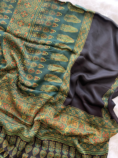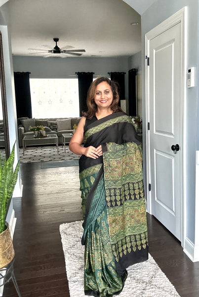 This is a beautiful handcrafted Modal Silk saree with Ajrakh block print technique is an all time classic! Hand block printed by Mater craftsmen one motif at a time in combination with layers of dyeing process, these are truly a piece of art and a result of immense creativity, hard work & imagination of the craftsmen! The beautiful motifs are inspired by the nature and its elements. This classic art is handmade in the state of Rajasthan in India.