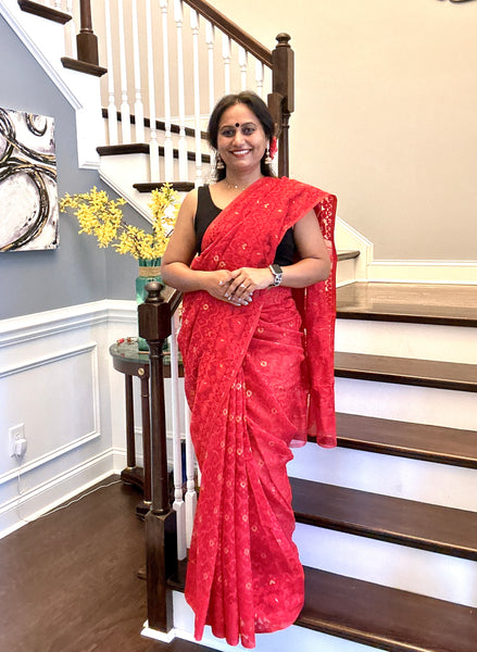 Embrace summer style and comfort with these light as air, beautiful, ever green, classy Jamdani Sarees! Exclusive Handloom cotton saree with a unique weaving design & pattern, Jamdanis are age old classics & a real beauty! This gorgeous Saree is in a bold red with buttis sprinkled all over and the borders! Light as air, this beauty is perfect for any season or occasion! The Saree comes complete with Fall & pico so it’s ready to wear!