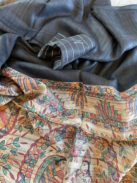This saree is a stunning Designer silk sari in Tussor in a plain ash black body and a beautiful intricate Madhubani design pallu! The motives are inspired by the traditional tribal art of the state of Bihar in India.
