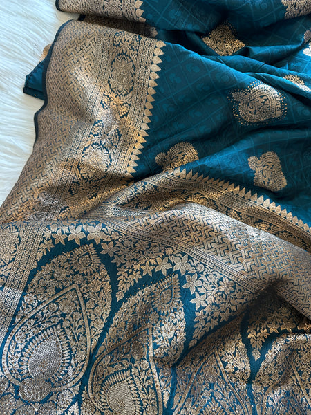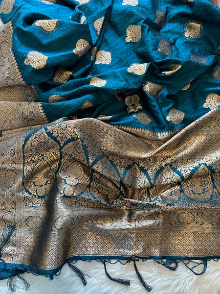 Your heart skips a beat when you lay your eyes on this opulent deep teal Banarasi Silk Saree, adorned further with champagne crystals, so elegant & classy! The tradional scroll and motif in matt gold-silver tone Zari work covers the entire saree making its so lovely for celebrations & festive season! Saree comes with a matching blouse material.