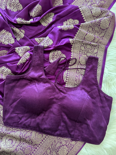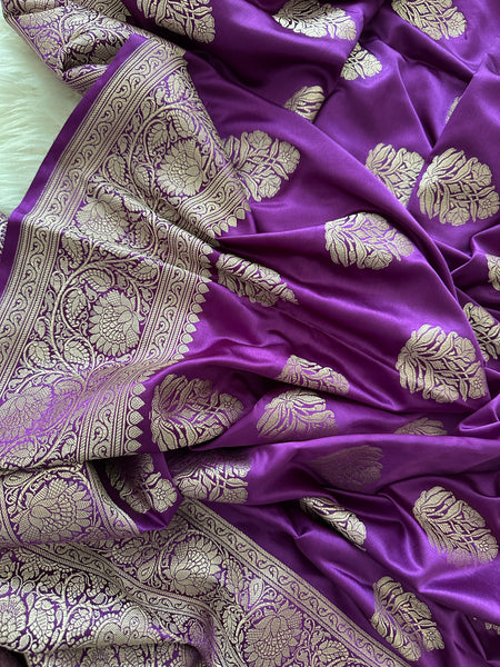 Your heart skips a beat when you lay your eyes on this opulent Banarasi Silk Saree in deep purple shade woven all over, so elegant & classy! The tradional scrolls border and motif in matt silverish gold tone Zari work covers the entire saree making its so lovely for celebrations & festive season!