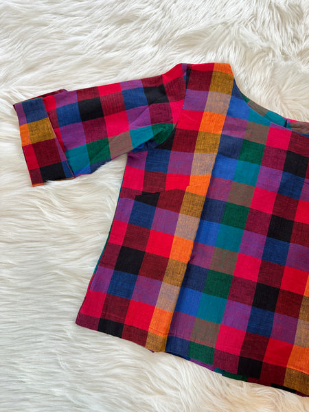 Beautiful handloom cotton crop top blouse in the most vibrant checkered pattern that is so much fun to mix and match be it a jeans or a saree or skirt! Make your own style statement with this cool chic blouse! Limited edition!