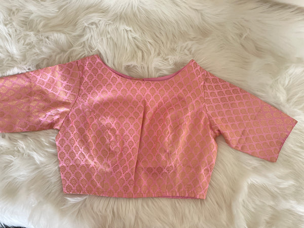 Beautiful brocade Silk blouse in a soft baby pink with very beautiful and subtle zari buttis, absolutely elegant for mix & match with many a sarees with endless combinations!