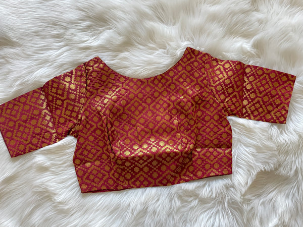 Beautiful brocade Silk blouse in deep maroon, this design is inspired by geometric Patola weave & pattern, absolutely elegant for mix & match with many a sarees with endless combinations!