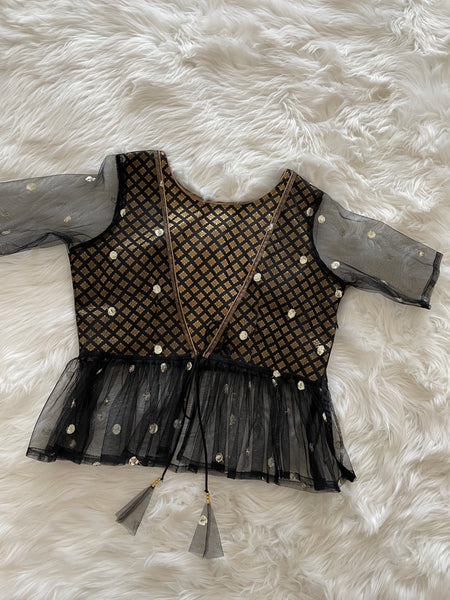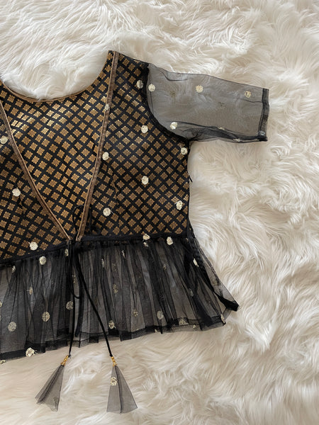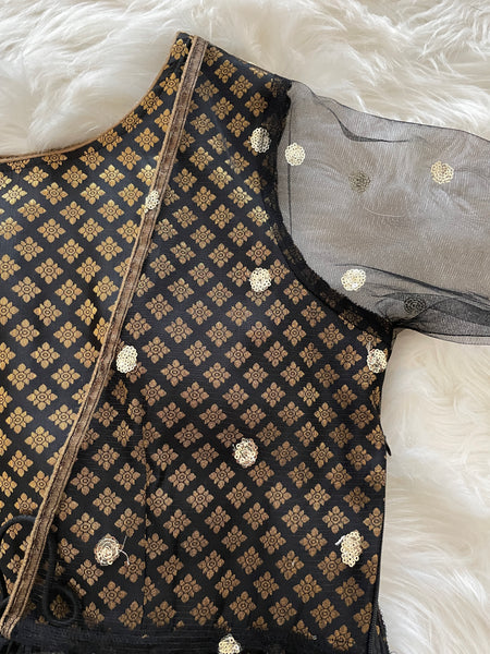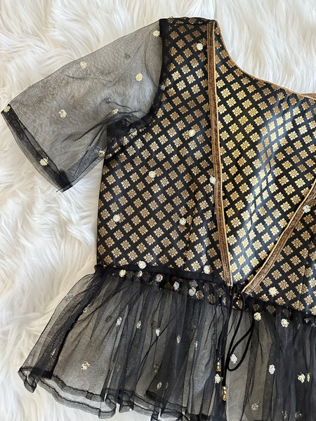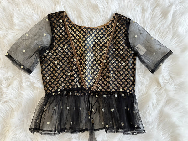 An absolutely beautiful brocade blouse with peplum style net jacket & wide sip this piece is versatile & so stylish! Black beautiful net embellished with gold sequins makes this lovely contemporary pattern a must have! Very pretty for mix & match with many a sarees, pants, jeans or even skirts! Pick your style from the endless possibilities!