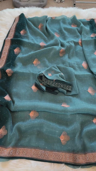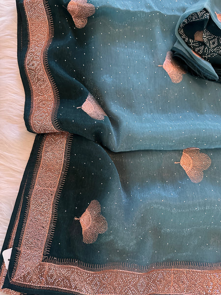 This saree is a beautiful Designer piece with intricate machine embroidery all over the borders and motifs scattered all over the saree! Light, classy and elegant with a hint of shimmer with the crystals all over, this sari is a beauty and perfect to rock any celebration!