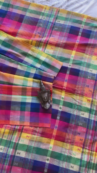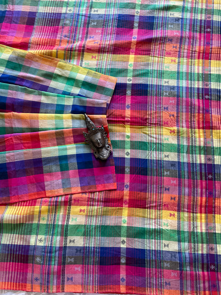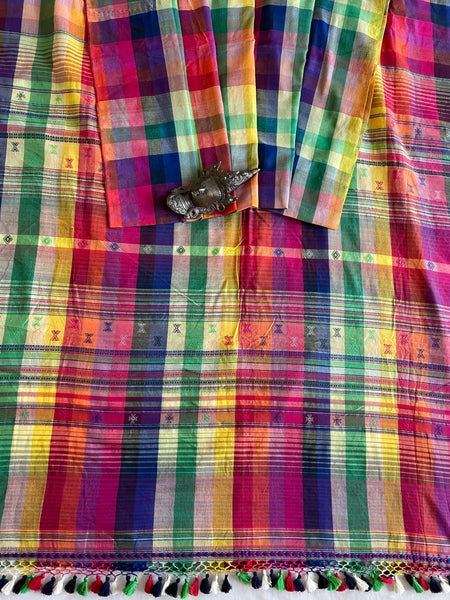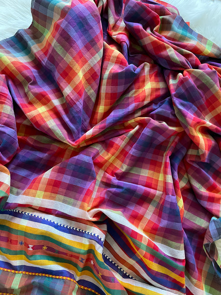 One of a kind, exclusive heritage weave is what this beauty is, called Bhujodi, from the region of Kutch, Rajasthan. Their distinct weaving tradition goes back to their connection with the Rabari tribe, who are pastoralists or shepherd communities believed to have travelled across the rugged mountains of Afghanistan and settled in Rajasthan about a thousand years ago handlooms & weaves are all time classics! This vibrant colorful cotton Saree is not only pretty but also very comfortable! Style it up with endless choices of T's, crop tops or blouses! Finished with pretty fun tassels, this one is sure to steal the show and wearable all year round!