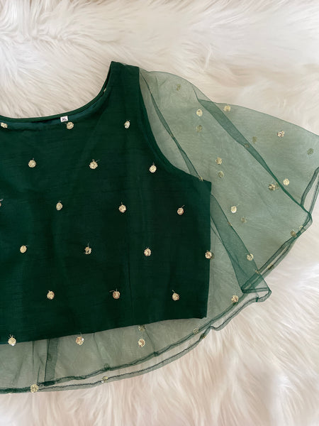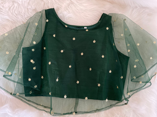 This you gotto have!! An absolutely beautiful cape crop top blouse that's versatile & so stylish! Deep bottle green silk with beautiful net embellished with gold sequins makes this lovely  contemporary pattern a must have! Very pretty for mix & match with many a sarees, pants, jeans or even skirts! Pick your style from the endless possibilities!
