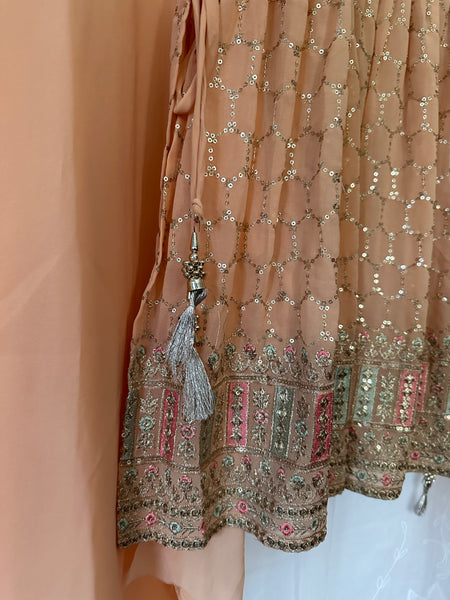 This beautiful set comes in Georgette material with a beautiful sequin embroidered Kurti, paired with plain palazzo pants & dupatta. The pants come with elastic waist, keeping it flexible and one size.