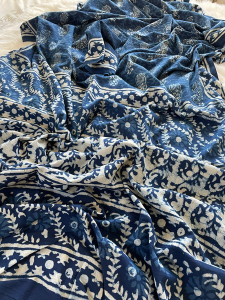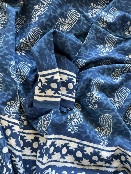Beautiful original block print Bagru Saree is a handcrafted cotton saree in a classic & beloved Indigo color that's so lovely for a Summery. This beauty has the popular peacock motif all over! Add some oomph to your look with a funky blouse & laced shoes or booties or lean towards a traditional look with a Banjara blouse & Juttis! Throw some bold antique silver jewelry on and finish the look!