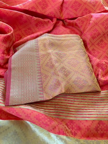 Beautiful Dola Silk saree with lovely Patola inspired weaving design & pattern all over. This gorgeous saree has very beautiful sheen and zari on pallu and borders. Festive and pretty, this beauty is perfect for any season or occasion! The Saree comes with a matching blouse material & complete with Fall & pico so it’s ready to wear!