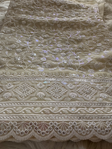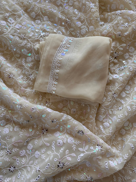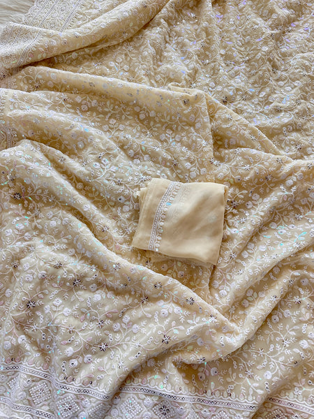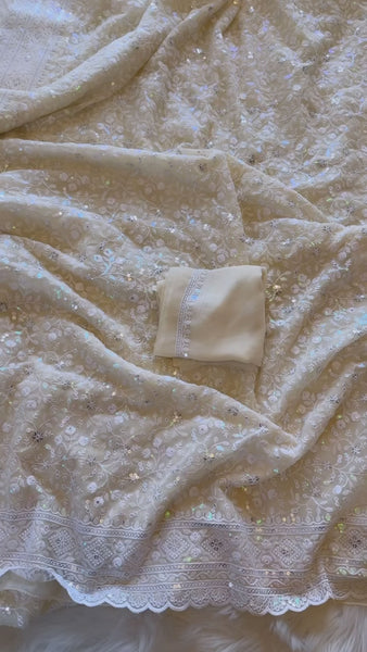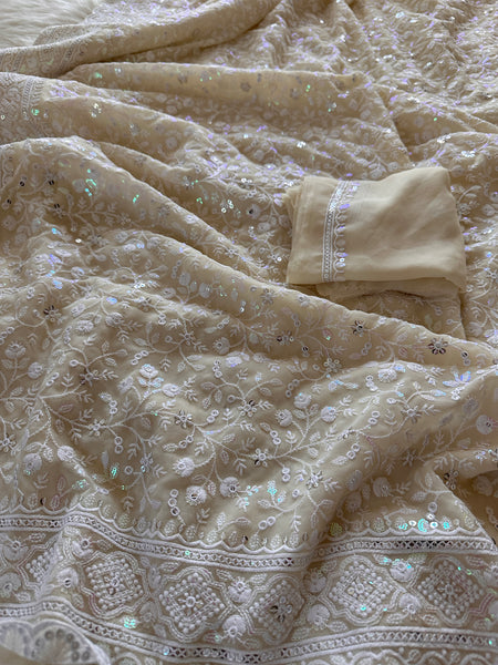 Georgette Chikanwork Saree - Ivory- Sitara Edition