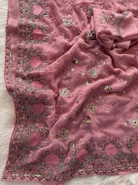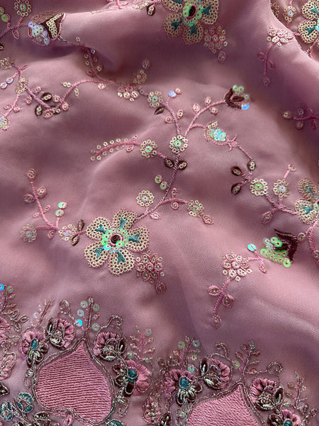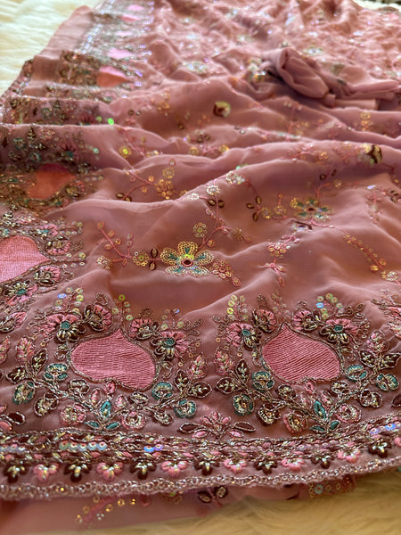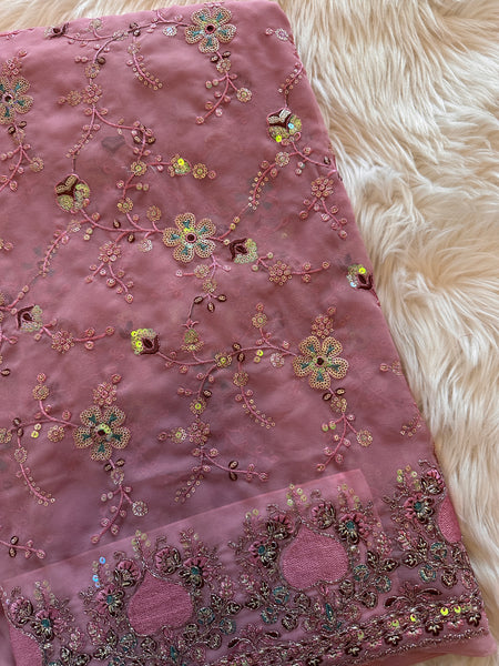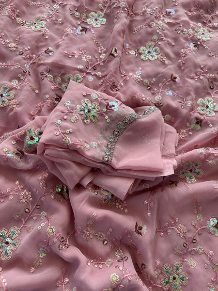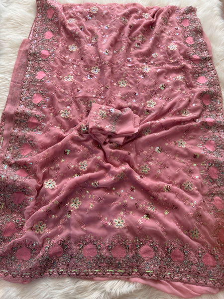 This saree is a stunning Designer Georgette Sari with extensive & intricate handcrafted embroidery all over the saree in classic metallic thread & sequins! Light, classy and elegant with a hint of shimmer, this sari is a beauty with motifs are inspired by nature!