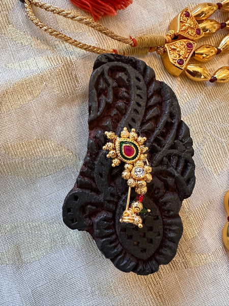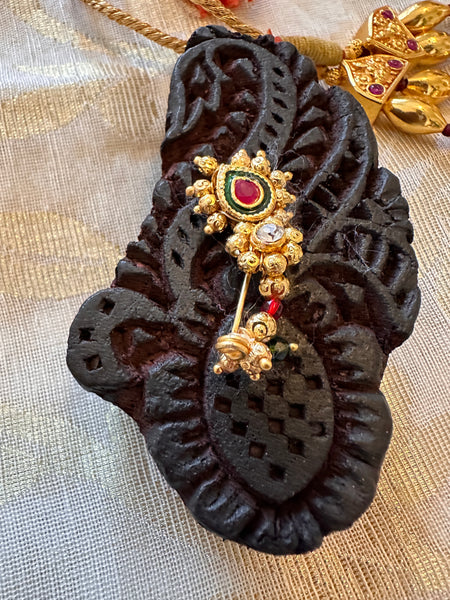 Beautiful Nath/nose pin is beautifully handcrafted with 1 gram gold polish & beads. This is a press nath & works best for both pierced & non-pierced noses. Add another layer of style to your beautiful Desi wardrobe with this nath for all festivities & celebrations!