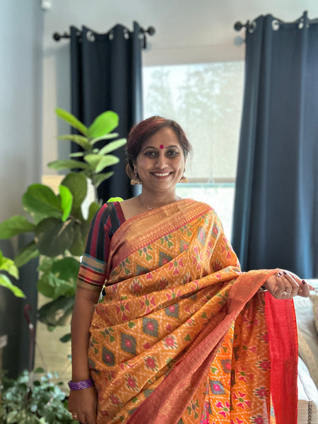 This beautiful ikkat print Silk saree is super soft & easy to drape with colorful play of ikkat motifs design & pattern all over. This gorgeous saree has very beautiful sheen and zari on pallu and borders. Festive and pretty, this beauty is perfect for any season or occasion!