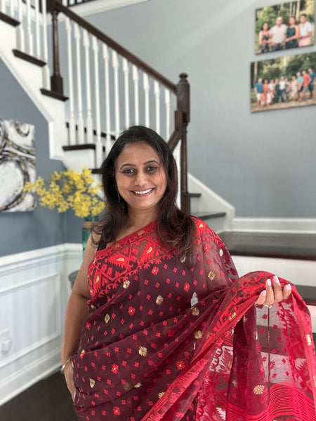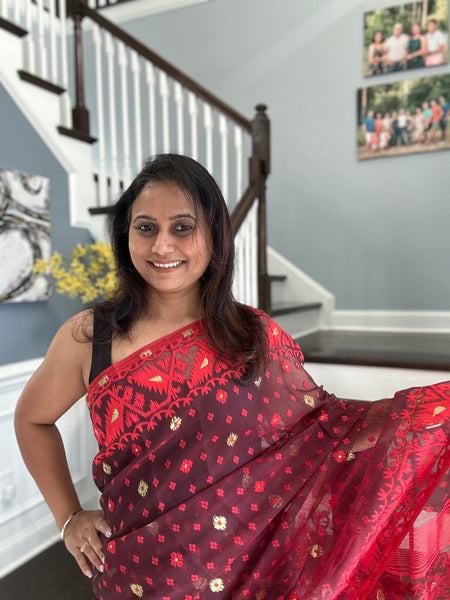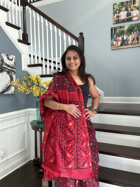 Exclusive Handloom Silk saree with a unique weaving design & pattern, Jamdanis are age old classics & a real beauty! This gorgeous Saree is in a classy black with yellow and red buttis sprinkled all over and the borders & anchal in bright red Jamdani weave! Light as air, this beauty is perfect for any season or occasion! The Saree comes complete with Fall & pico so it’s ready to wear!