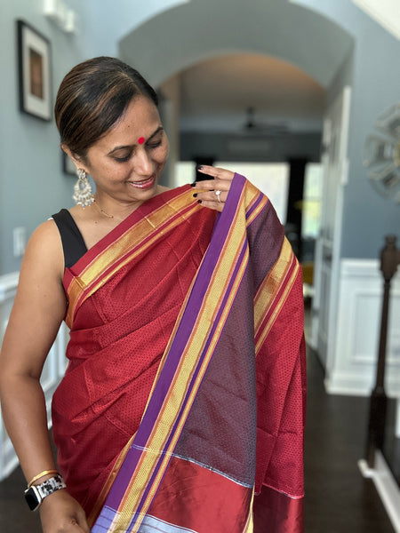 Khun fabric, finding its roots in the state of Maharashtra and North Karnataka comes in combinations. This exquisite fabric having a rich and lustrous texture is available in innumerable designs, motifs and patterns on the cloth. Traditionally Khun was used to make only blouses, but today weavers have evolved to make them suitable for sarees and a whole other range of women's wear. Bold colors, bold patterns yet simple and elegant. That's how a Khun saree is described. Accentuate your beauty feeling the comforting embrace of this refreshing handwoven piece in lovely shades!