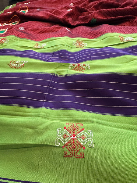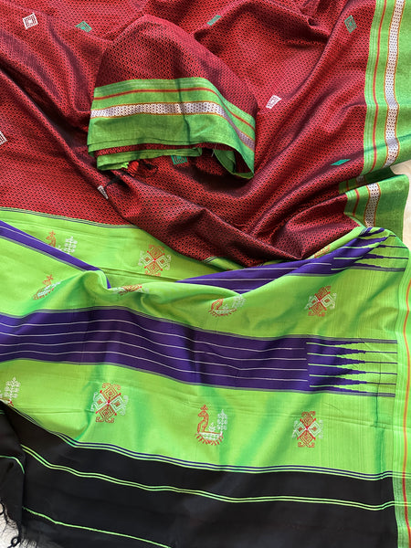 • Khun fabric, finding its roots in the state of Maharashtra and North Karnataka comes in combinations.This exquisite fabric having a rich and lustrous texture is available in innumerable designs, motifs and patterns on the cloth. Traditionally Khun was used to make only blouses, but today weavers have evolved to make them suitable for sarees and a whole other range of women's wear. Bold colors, bold patterns yet simple and elegant. That's how a Khun saree is described. Accentuate your beauty feeling the comforting embrace of this refreshing handwoven piece in lovely shades!