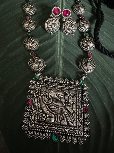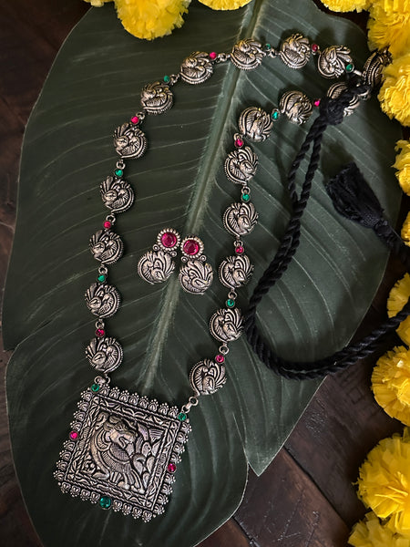 One of a kind designer set inspired from Kolhapur traditional Jewelry, this beauty is an elegant piece for any occasion or festive season! With a handmade cord that is adjustable, this set comes with earrings too and certainly makes for a statement piece!