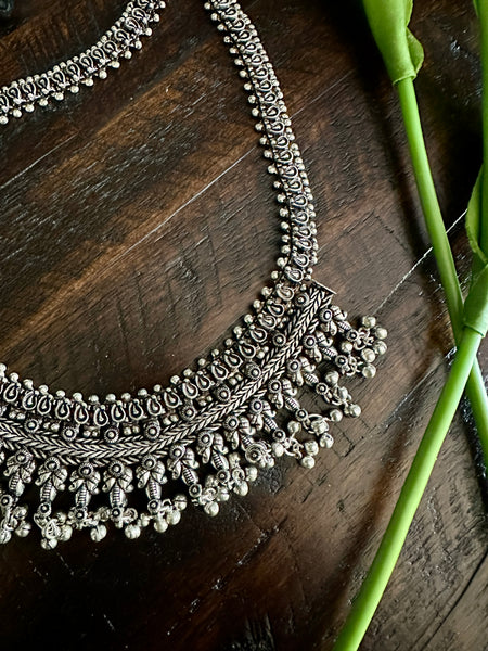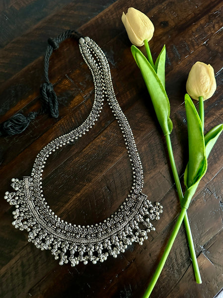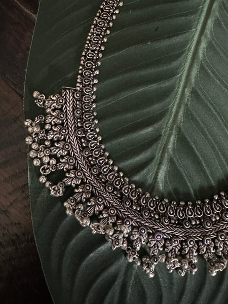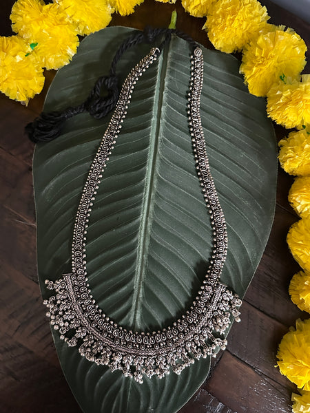 One of a kind handcrafted designer Temple necklace is inspired from Kolhapur traditional Jewelry, this beauty is an elegant piece for any occasion or festive season! With a handmade cord that is adjustable, this set comes with earrings too and certainly makes for a statement piece!