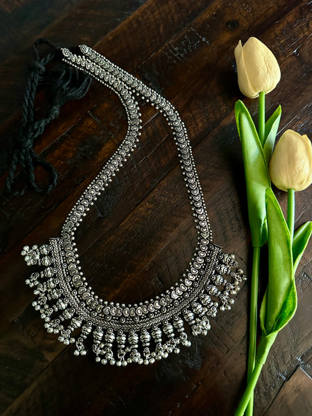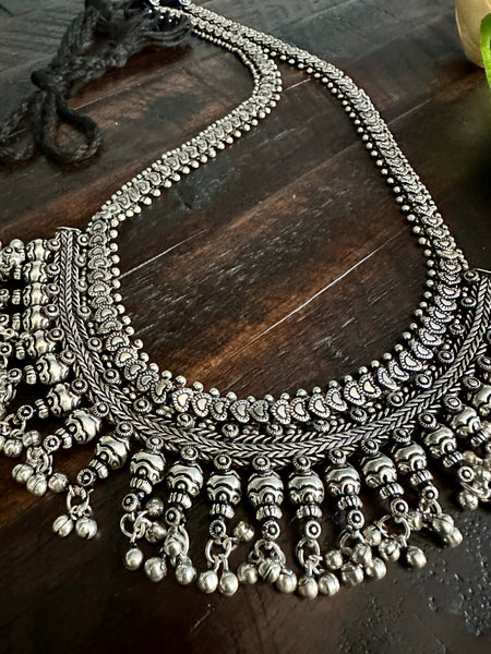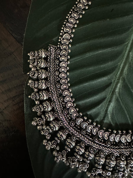 One of a kind handcrafted designer Temple necklace is inspired from Kolhapur traditional Jewelry, this beauty is an elegant piece for any occasion or festive season! With a handmade cord that is adjustable, this set comes with earrings too and certainly makes for a statement piece!
