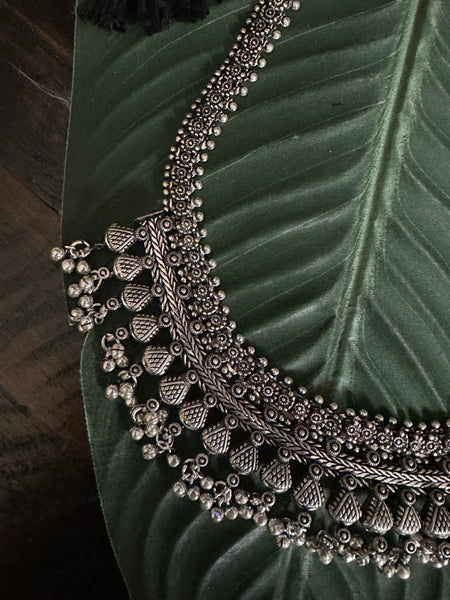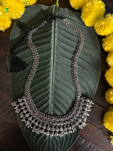 One of a kind handcrafted designer Temple necklace is inspired from Kolhapur traditional Jewelry, this beauty is an elegant piece for any occasion or festive season! With a handmade cord that is adjustable, this set comes with earrings too and certainly makes for a statement piece!