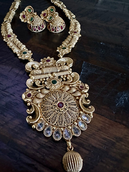 This beautiful Designer Rajwadi work necklace in antique gold finish paired with ruby & green colored stones makes a lovely statement piece! This art is the most royal, elegant & classy! The set comes with lovely matching earrings & you can adjust the cord length as well.