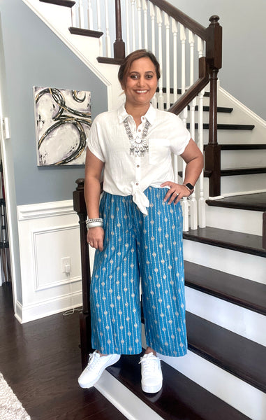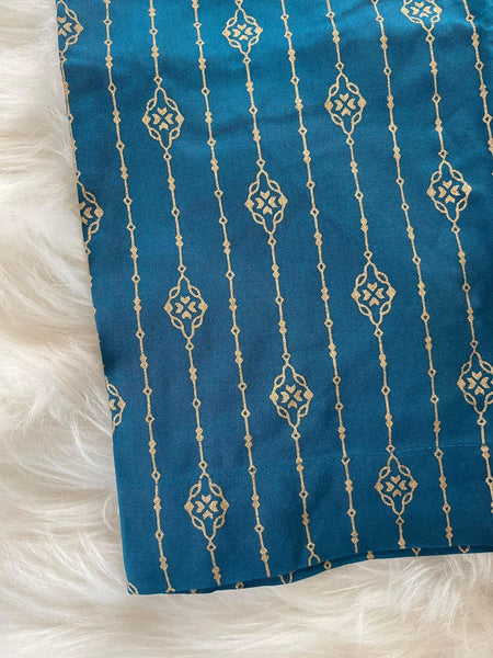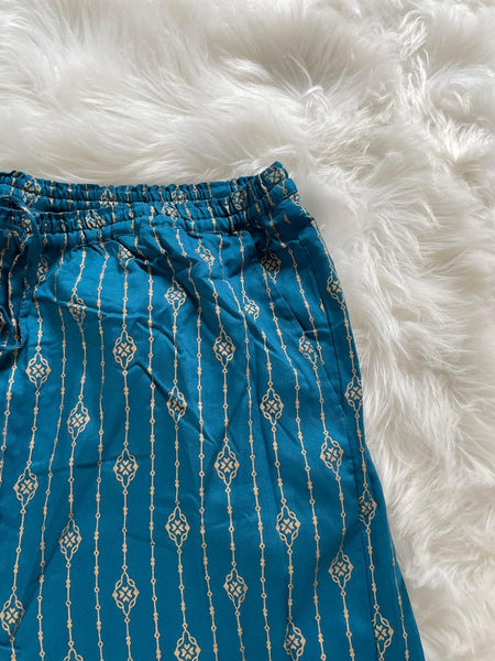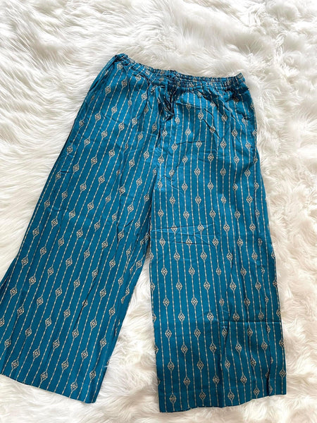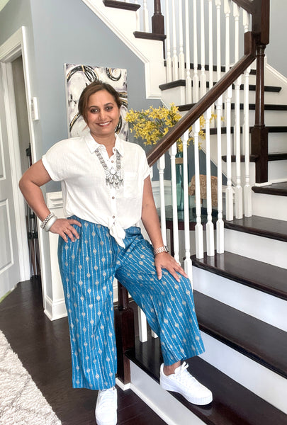 Fun & oh so vibrant, these beautifully tailored 3/4 length culottes are simply perfect to enjoy in many seasons & occasions! Flaunt them in a Desi fusion style, or wear it in traditional style, these sure are fun! Soft printed cotton makes this very comfortable for the sultry summer to layering up for Fall season!