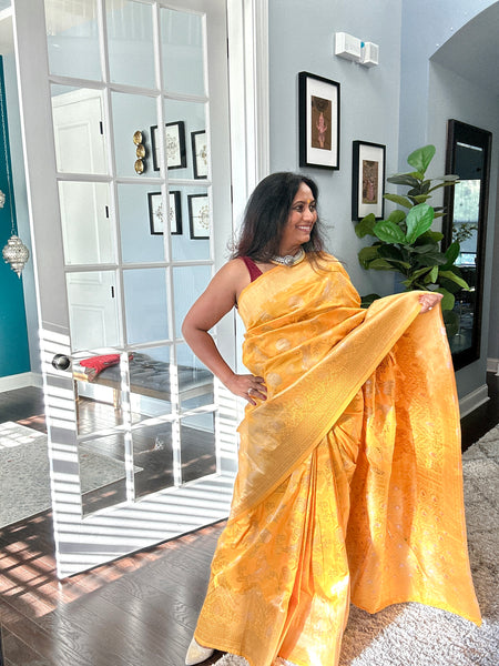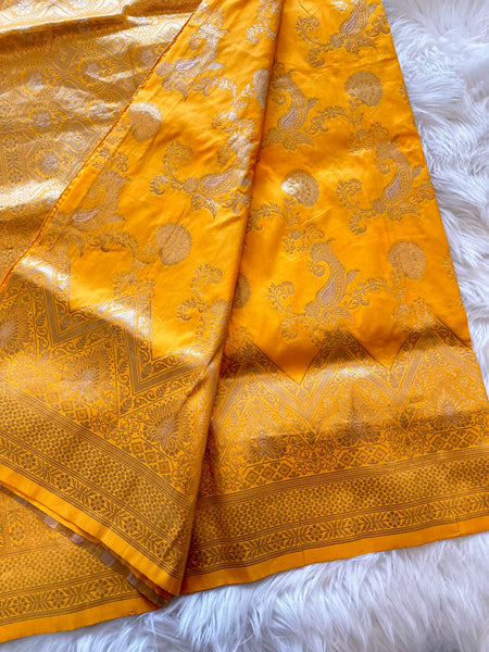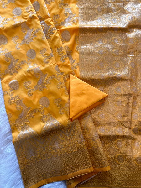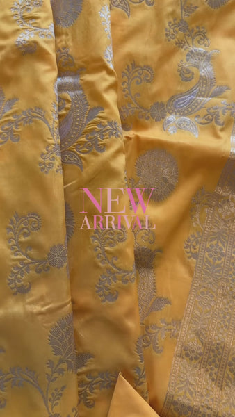Your heart skips a beat when you lay your eyes on this opulent Banarasi Silk Saree, so elegant & classy! The floral motif in matt gold-silver tone Zari work covers the entire saree making its so lovely for celebrations & festive season! Saree comes with a matching blouse material & complete with Fall & pico so its ready to wear!