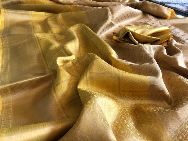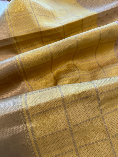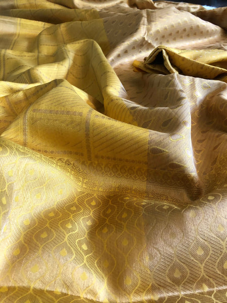 Exclusive Handloom Silk saree with a unique weaving design & pattern. Saree is dual tone with lower half as a different shade of yellow while self zari delicate design makes it elegant & classy!