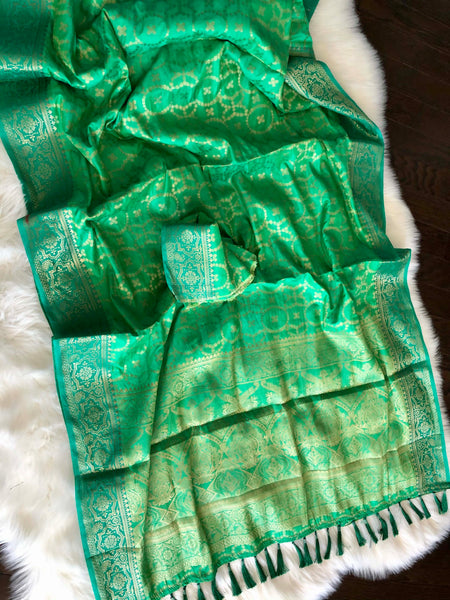 Exclusive Handloom Silk saree with a unique Designer weaving design & Patola inspired pattern. Finished with tassels zari delicate design makes it elegant & classy! Saree comes with a matching blouse material & complete with Fall & pico so its ready to wear!